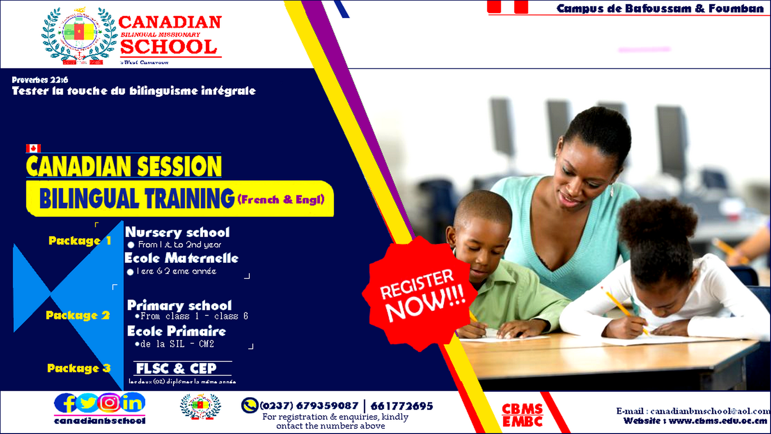 Suivez l'Ecole Missionnaire Bilingue Canadienne sur nos Pages officielles avec ces liens et abonnez-vous :